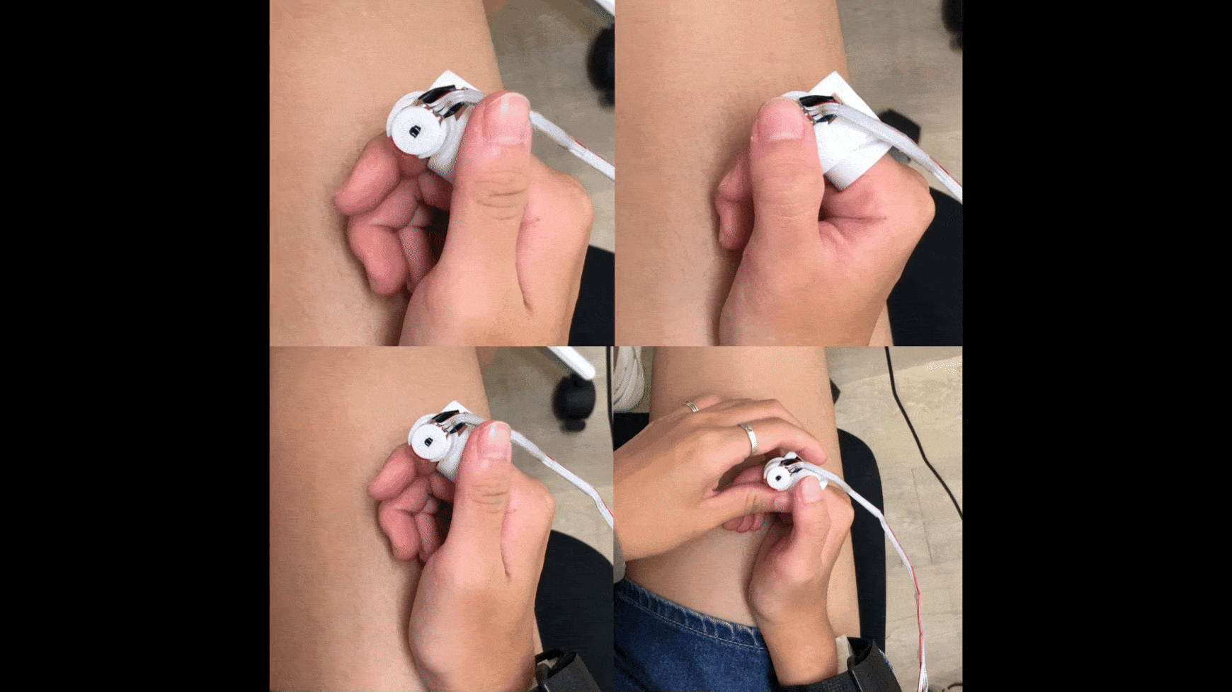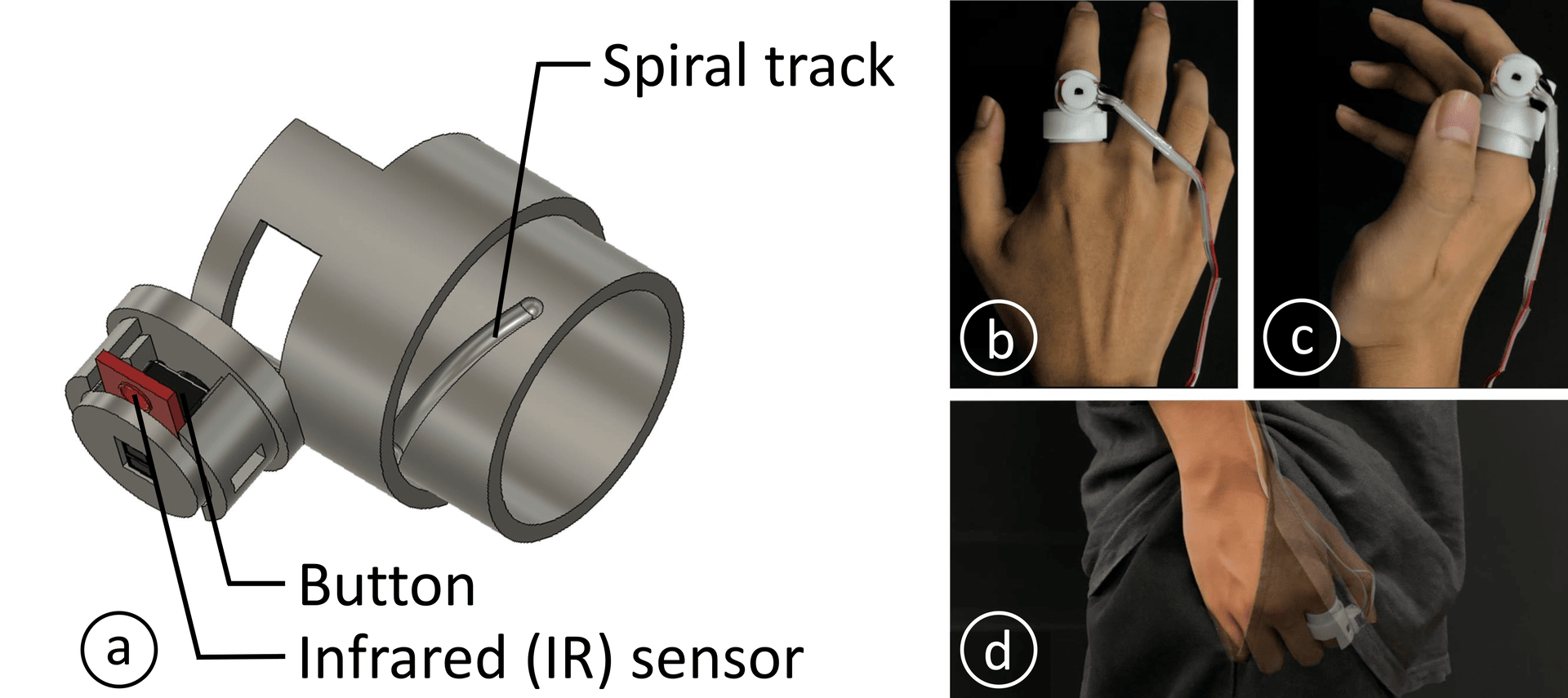 The ring, equipped with a button, an infrared (IR) sensor, and spiral tracks, is worn on the index finger. Its primary function is to confirm selections made by the user’s gaze, pressing the button with the thumb executes the confirmation.