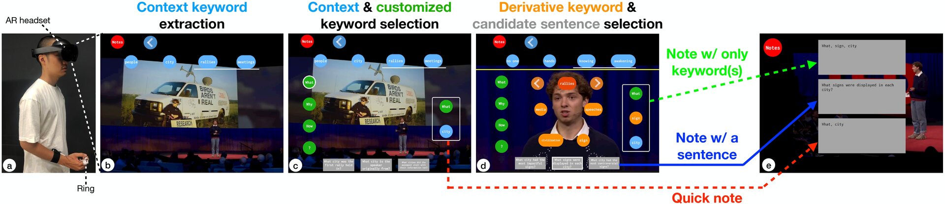 (a) An AR headset and a ring are worn for note-taking in a speech/discussion.